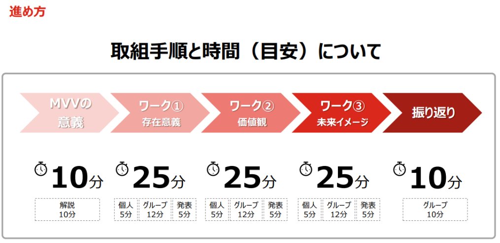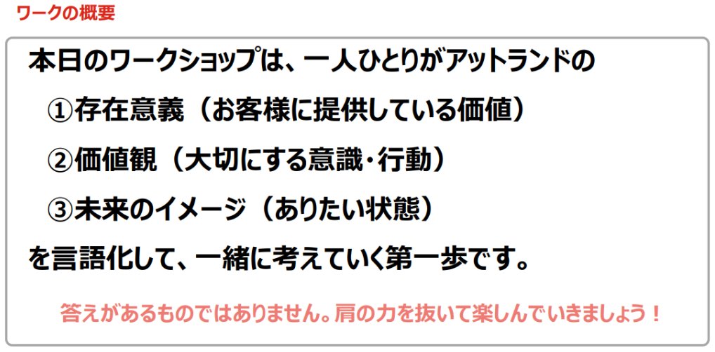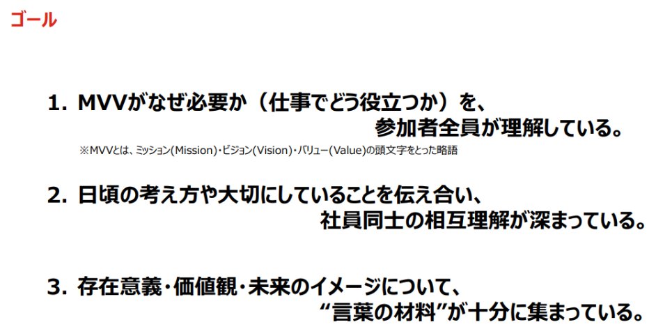 ・社員全員がMVV(「Mission(使命・存在意義)」「Vision(目指す姿)」「Value(価値観・⾏動指針)」)の必要性や意義を理解し、社員同⼠で価値観や⼤切にしていることを共有して相互理解を深めることができるよう、社員全員参加での実施としました。
