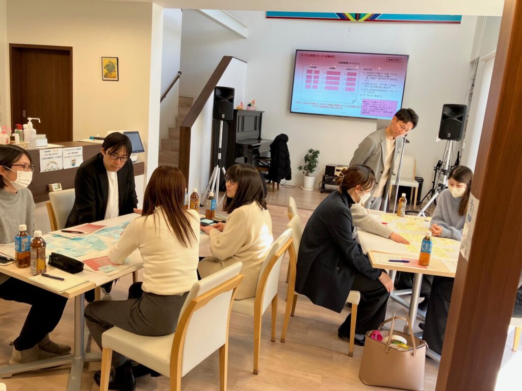 多様な価値観を尊重しながら組織としての方向性を共創するため、全社員参加型のビジョン策定ワークショップを実施。会社の「存在意義」「価値観」「未来像」についてグループで意⾒を出し合うワークを⾏いました。