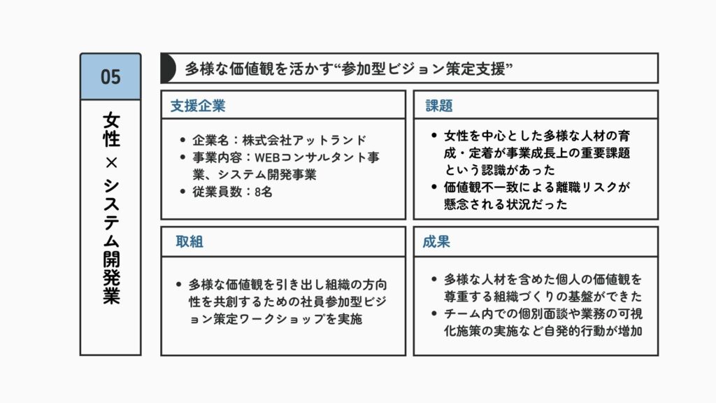 また事業の特性上、クライアントごとの課題に応じた個別対応が多く、社員⼀⼈ひとりの知⾒・経験が成果や生産性に直結しやすい状況にあり、育成と定着が事業成⻑を左右する重要なテーマとなっていました。